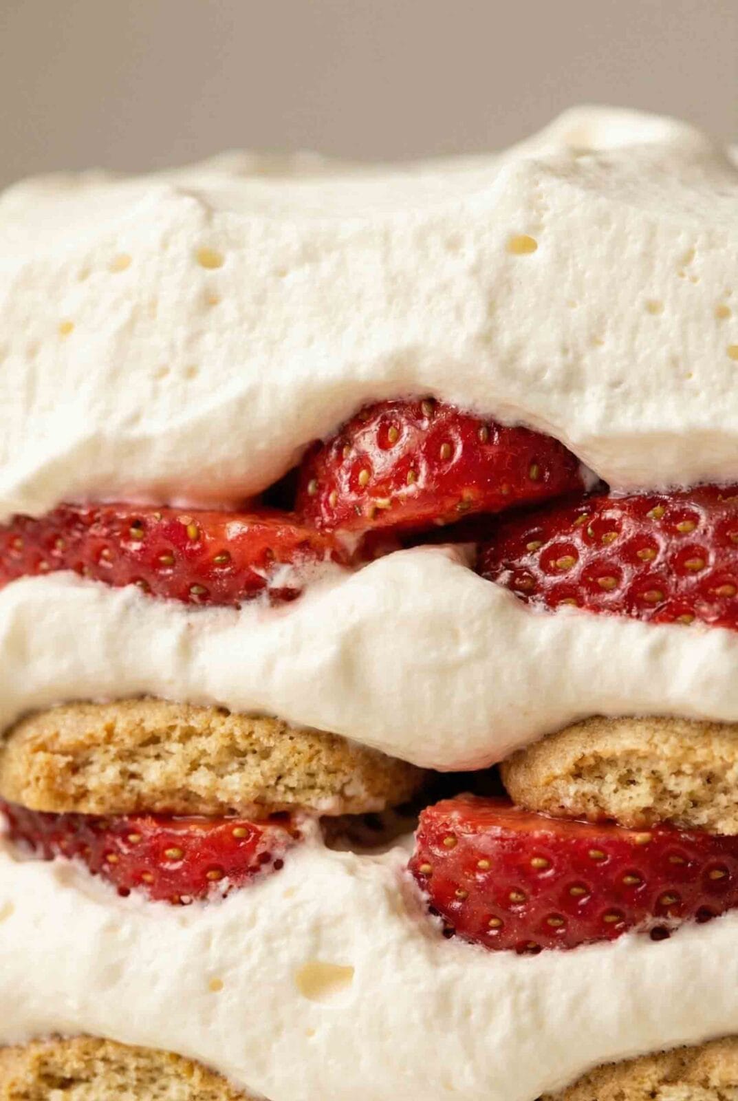 Fresh strawberries, lightly drained to control moisture, layered with whipped cream and graham crackers that soften slowly in the fridge. No baking, no batter—just clean hydration and slices that hold.